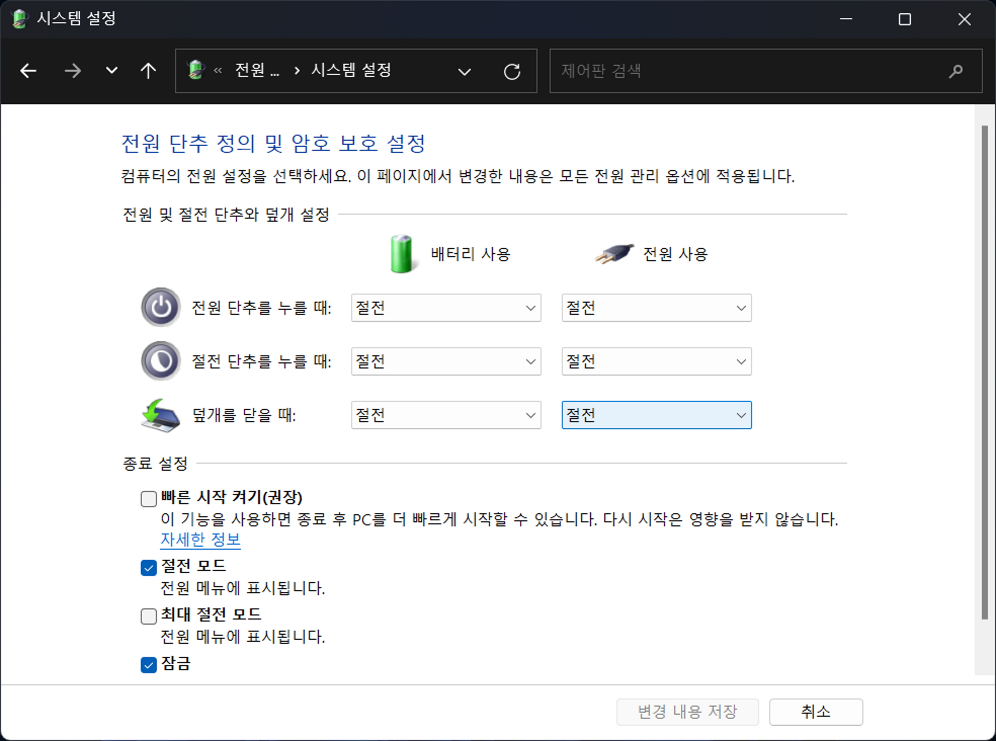 - [제어판] > [시스템 및 보안] > [전원 옵션] > '전원 단추 작동 설정'에서 "빠른 시작 켜기" 옵션 해제