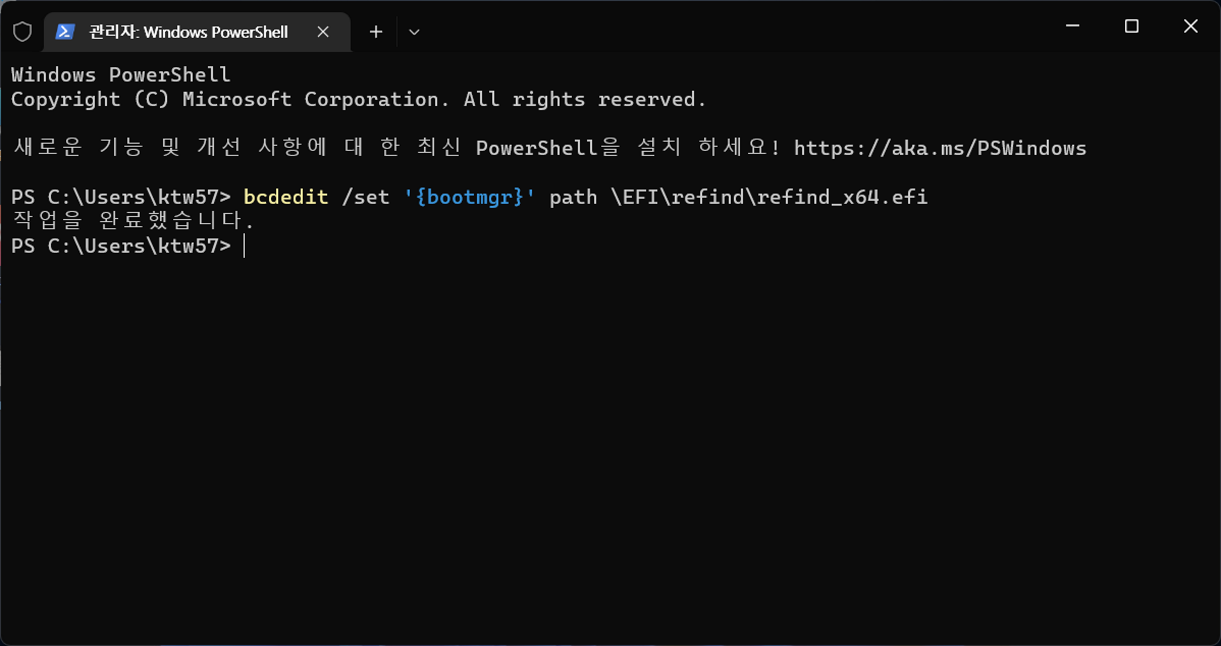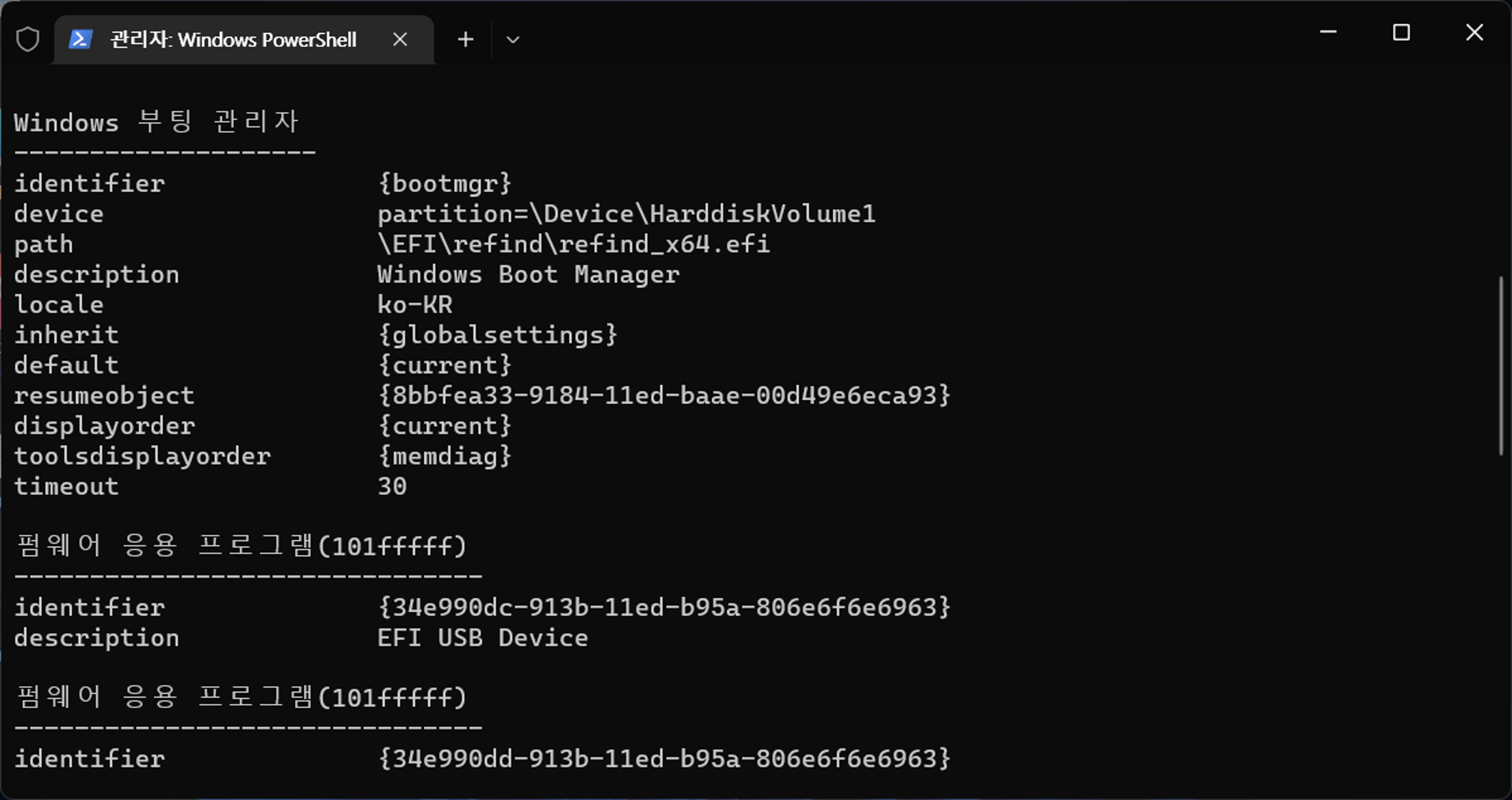 2. 다음 명령어를 실행하여 나오는 EFI 부트 옵션 목록 중에서 'Windows 부팅 관리자'의 path가 \EFI\refind\refind_x64.efi 로 나온다면 설정 완료.